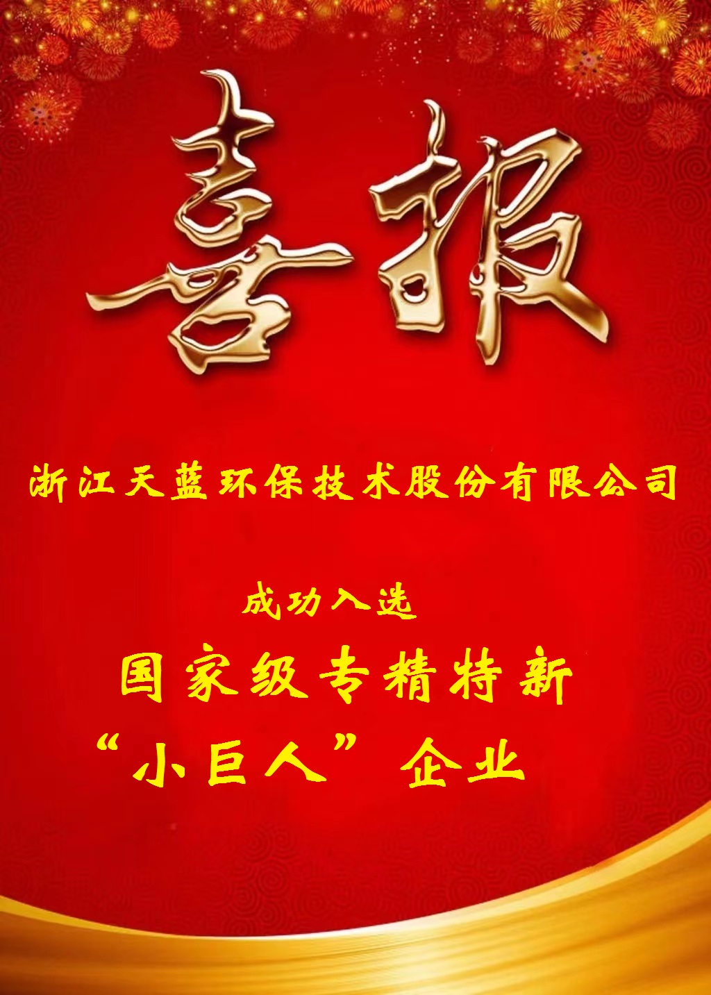 近日,浙江省經濟和信息化廳發布了《關于浙江省第四批專精特新“小巨人”企業和第一批專精特新“小巨人”復核通過企業名單的公示》,天藍環保憑借在大氣污染治理領域的技術創新綜合實力和市場占有率,成功入選國家級專精特新“小巨人”企業名單。